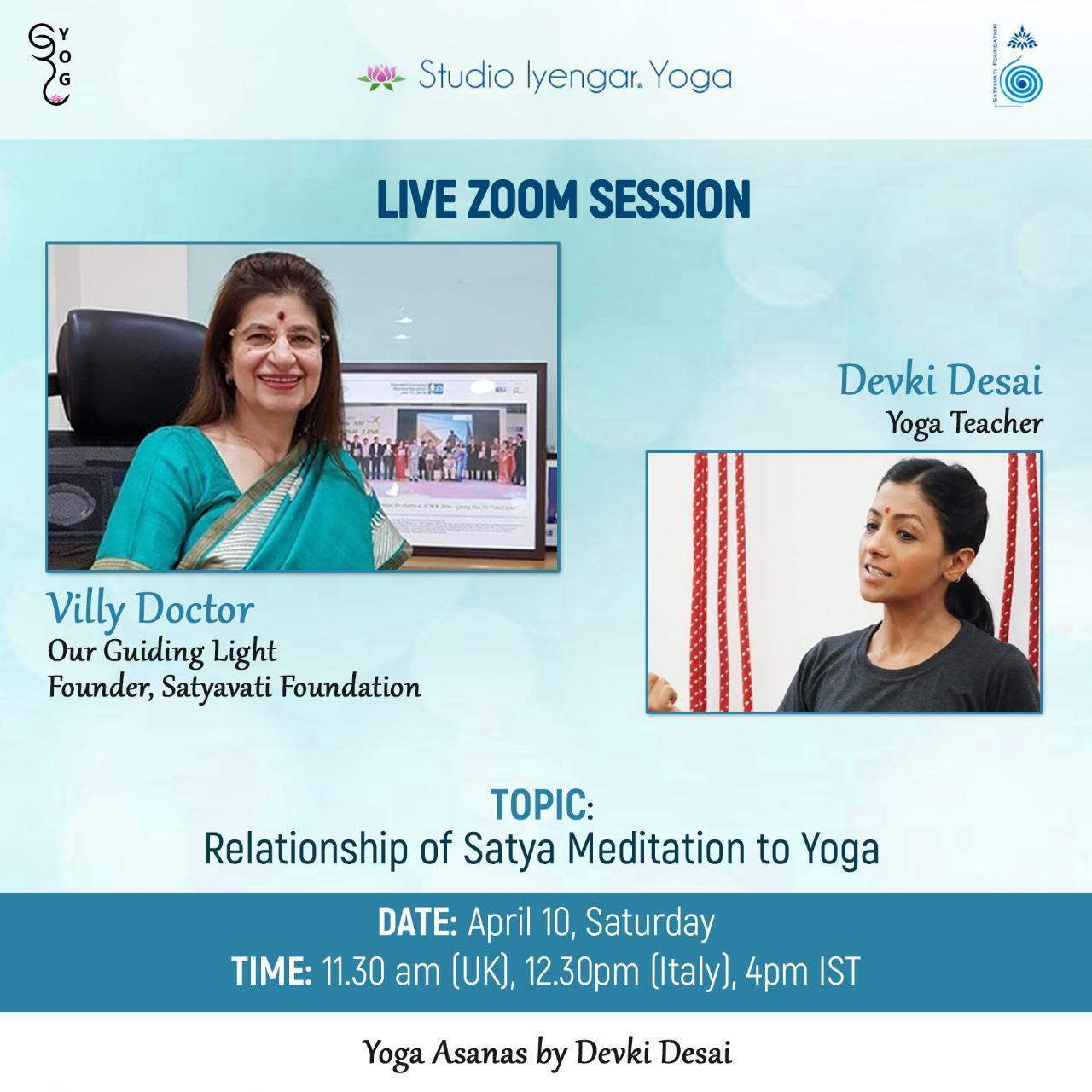 This Saturday April 10th, from 11:30am-1:30pm(UK time), join us for this special session of Yoga Asanas with Devki Desai and Satya Meditation with Villy Doctor. To register please visit: https://yogafh.wordpress.com/iyengar-yoga-workshop-with-devki-desai/